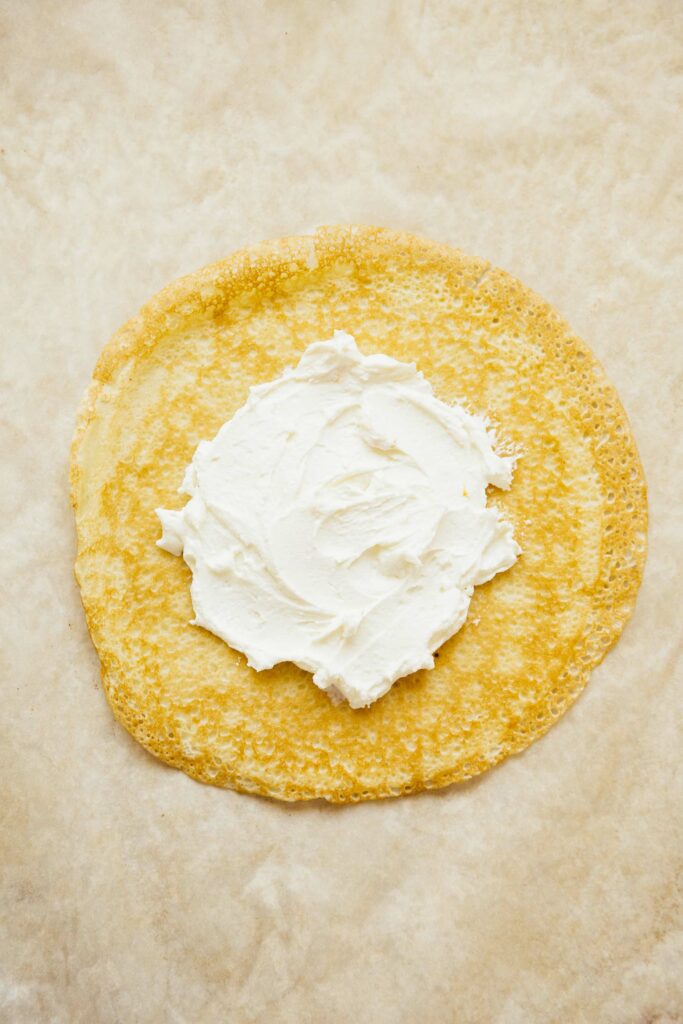 Lay out the crepes and divide the ricotta mixture evenly among them, placing the ricotta in the center of each crepe. Fold the right and left sides of the crepe toward the center, then bring the bottom of the crepe (where the filling is) toward the top, making a little parcel. Place the crepes in a baking dish.