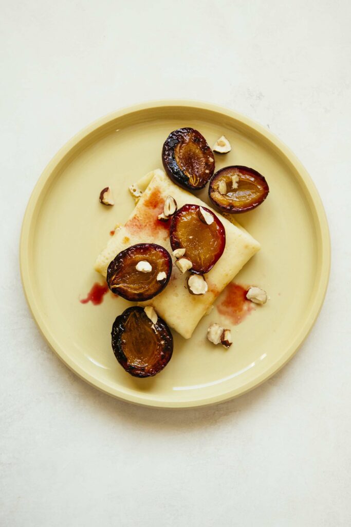 This is one of my favorite desserts not only because I love a tender crepe filled with sweet ricotta balanced by tart, cooked plums and the crunch of slightly bitter hazelnuts, but also because it can be made well in advance and reheated at the last minute for maximum ease.